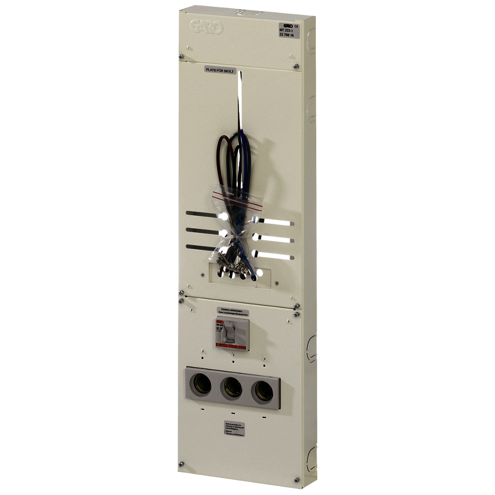 Mätartavlan är utrutstad med kunds strömbrytare samt mätarsäkringar som är placerade på mätartavlan. Smidiga och kompletta produkter för energimätning. Mätartavla med brytare och säkring 1-plats 2 40A 3pol.